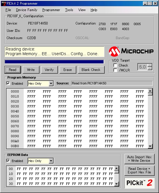 こちらは今回作成したバルクイレーズプログラムによって全消去したあとのPIC18F14K50をPIC WRITERでREADしてみた画面です。