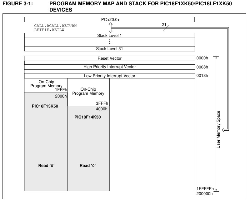 ところがPIC18F13K50のプログラムメモリはアドレス1FFFまでしか実装されていないのでアドレス2000を読み出すと00が返ってきたのでした。