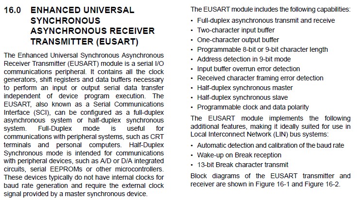 EUSARTは全二重非同期通信、半二重同期通信ができるシリアルコミュニケーションインターフェース(SCI)です。