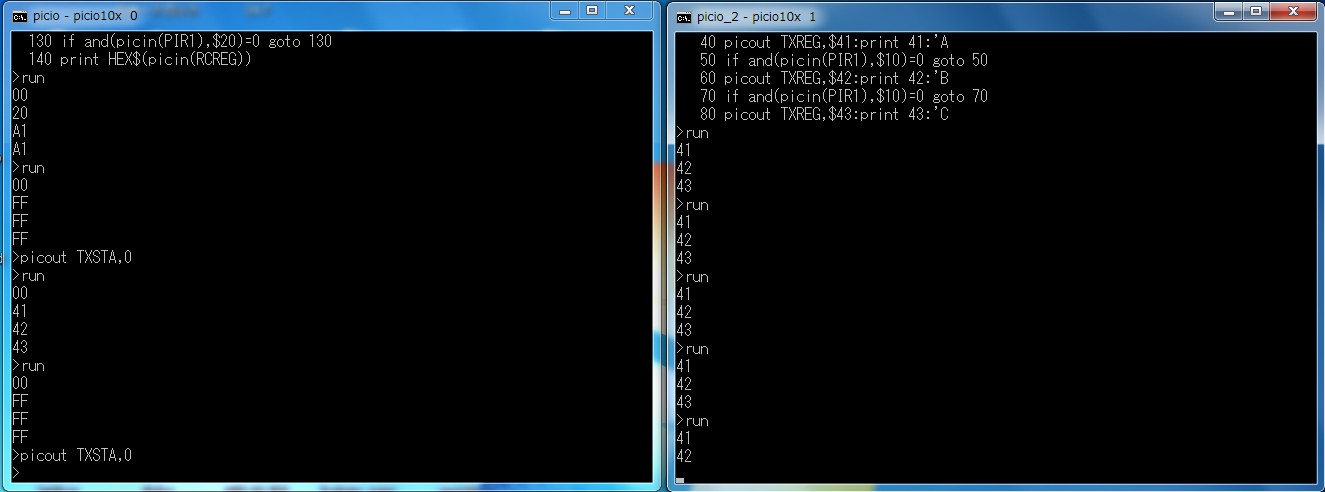 先に左側でpicout TXSTA,0を実行してから次に右側のrunを実行しました。