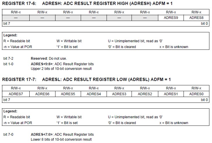 コンバータは10bitの2進数近似値を生成してそのコンバート値をADCリザルトレジスタ(ADRESLおよびADRESH)に格納します。