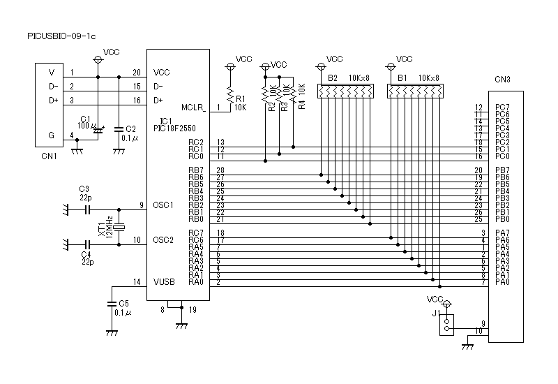 そのあたりのことを理解していただくためとテストプログラムの説明のための参考としてPICUSBIO−09の回路図を下に示します。