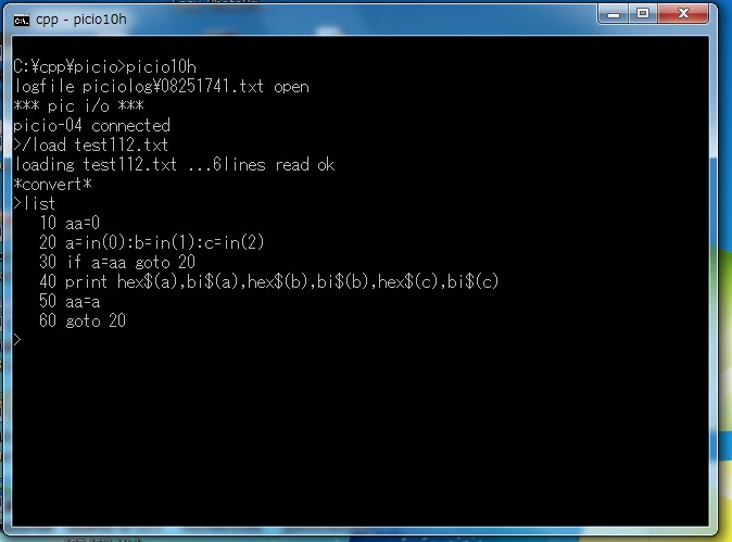 PICUSBIO−01の入力ポートのテストは[第41回]でND80Z3.5のI/O入出力コネクタと接続してND80Z3.5のZB3BASICプログラムで作成出力したSINウェーブデータを受けてそれをPRINT文の簡易グラフとして表示するという形で行ないました。