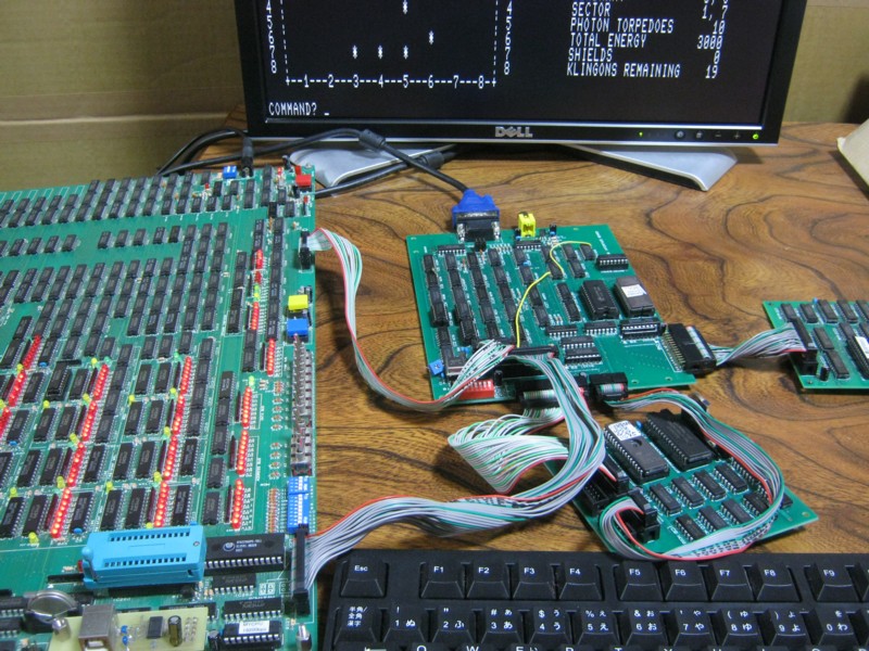 独立型MYCPU80にROM/RAM/RTCボードを接続して、SDカードベースのZB3DOS(CP/M互換DOS)を起動して、MBASICを起動し、”STARTREK”を実行しています。