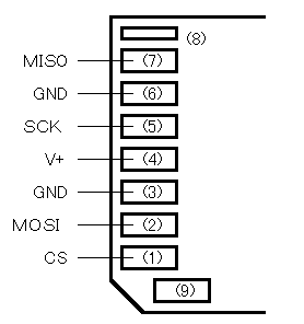 本来のSDモードとSPIモードとでは使う端子及び信号名が異なるのですが、本稿ではSPIモードしか使いませんからSPIモードでの端子接続についてのみ記します。
