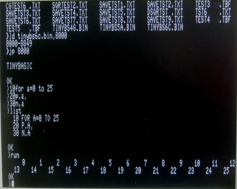 ND80KL/86(KL5C80A12版)をマイコン独立化セットに接続した場合も、ND80Z3.5を接続したときと全く同じように独立化セット用中日電工版TINY BASIC(スクリーンエディタ版)tinybs6c.binが動作することを確認しました。
