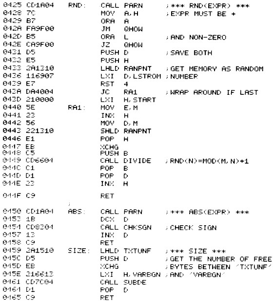 それではTINY BASICのRNDプログラムは?といいますと、上で説明しましたようになんだかあっけないくらい簡単なプログラムです。
