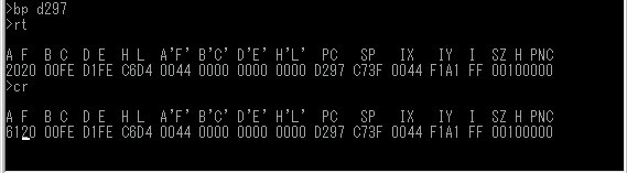 >bp d299 >rt A F B C D E H L A'F' B'C' D'E' H'L' PC SP IX IY I SZ H PNC 6122 00FE D1FE C6D4 0044 0000 0000 0000 D299 C73F 0044 F1A1 FF 00100010 |