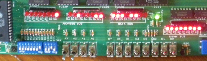 アドレス設定用のディップスイッチ、トグルスイッチが0123になっていて、データ設定用のトグルスイッチがFFになっていれば、メモリアドレス0123の値がDATA BUS(外部データバス)LEDに表示されます。