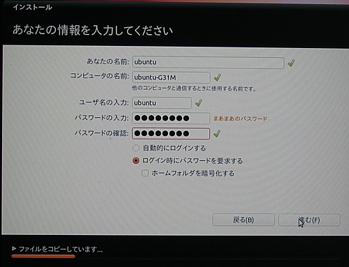 ところでさきほどの名前の入力画面で、「あなたの名前」(ubuntu)を入力すると、「コンピュータの名前」には、そのうしろにG31Mが付加されて、ubuntu−G31Mと表示されました。