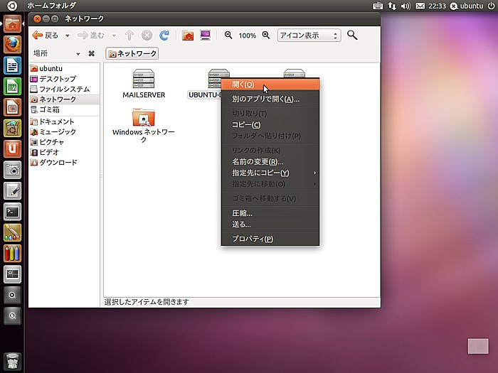 もう一度「ネットワーク」を開いて、UBUNTUマシン(ubuntu−desktop)を開いてみます。