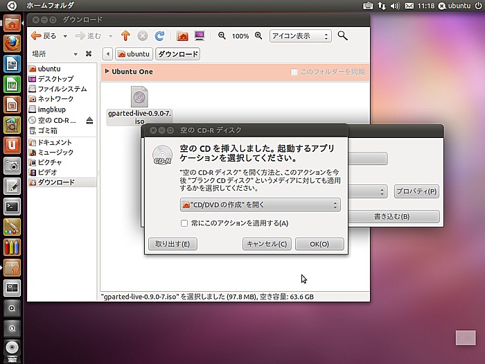 せっかくUBUNTU11.04を使っているのですから、今回はGPartedのisoイメージをインターネットからダウンロードして、CDROMに焼くところまでを、UBUNTU11.04上でやってみることにいたします。
