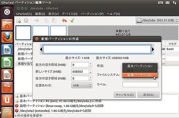前回は拡張パーティションを削除するために、まずその中にあるスワップパーティションを削除しました。