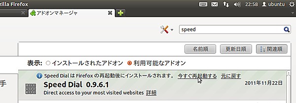「SpeedDialはFirefoxの再起動後にインストールされます」と表示されます。