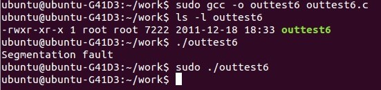 上に書きましたように、outtest6をユーザー(ubuntu)が実行すると、Segmentation faultが表示されてしまい、実行されません。