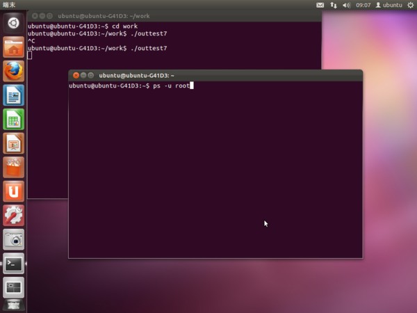 ここで、ある条件でいきなりUbuntu11.10を終了しようとすると、outtest7が終了されないでそのまま実行を続けることになるのですが、その状況をここで再現してみても、画面からはわかりませんから、そうすることはあまり意味のあることではありません。