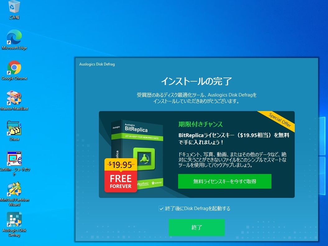 「終了」をクリックするとインストールが完了しDisk Defragが起動します。